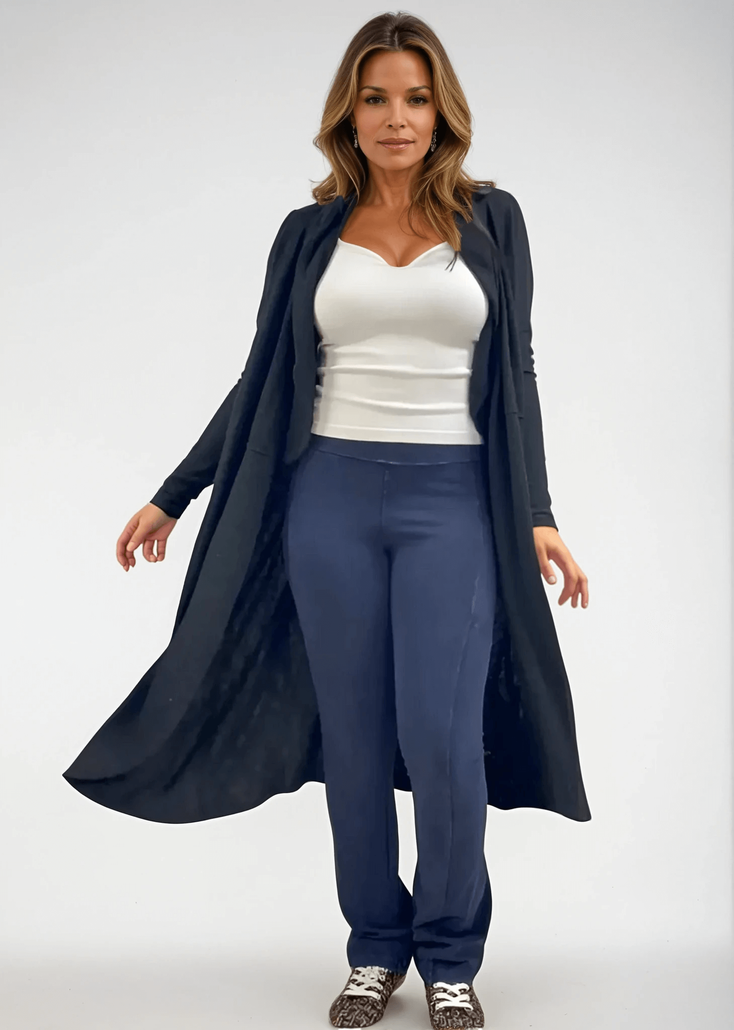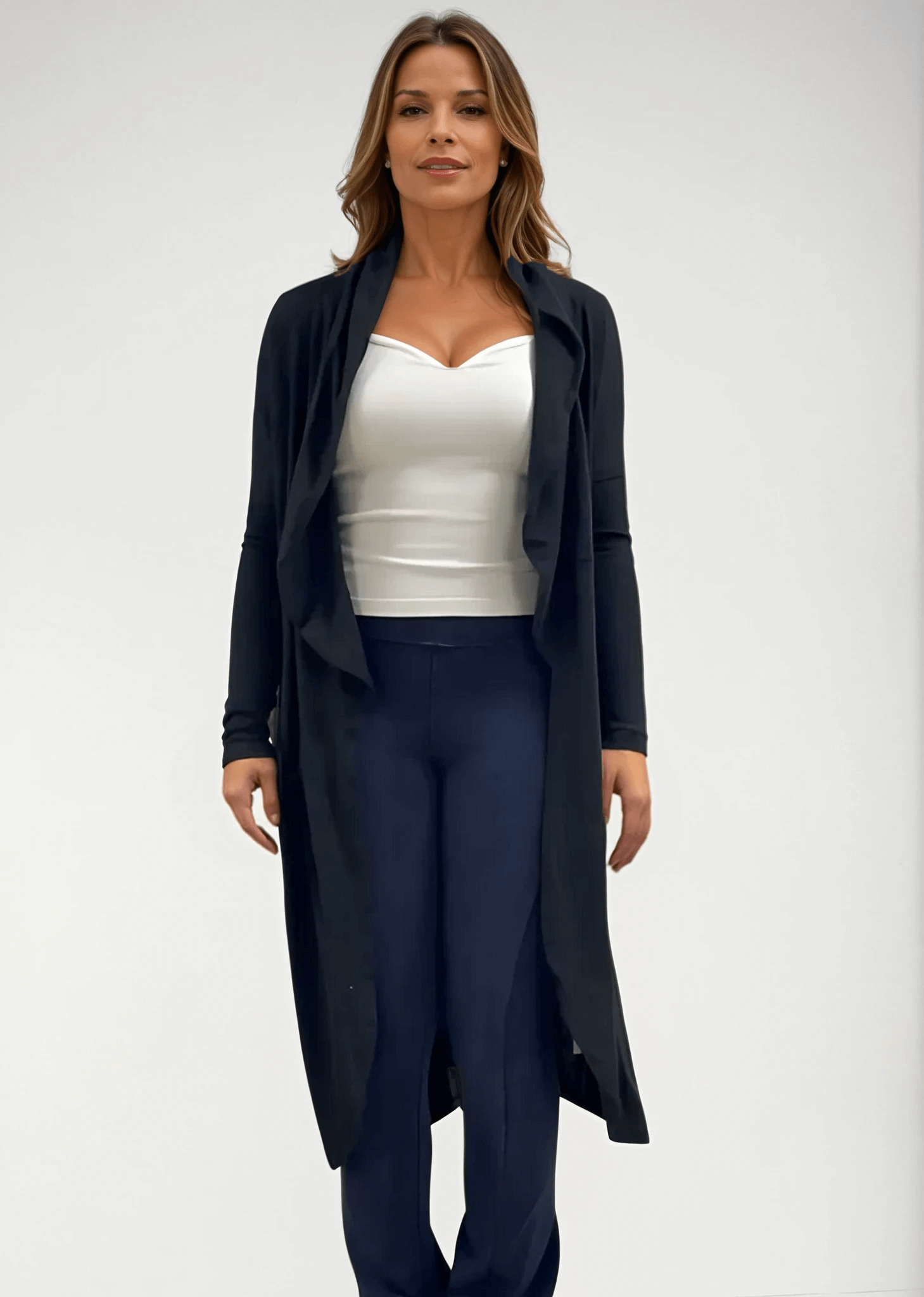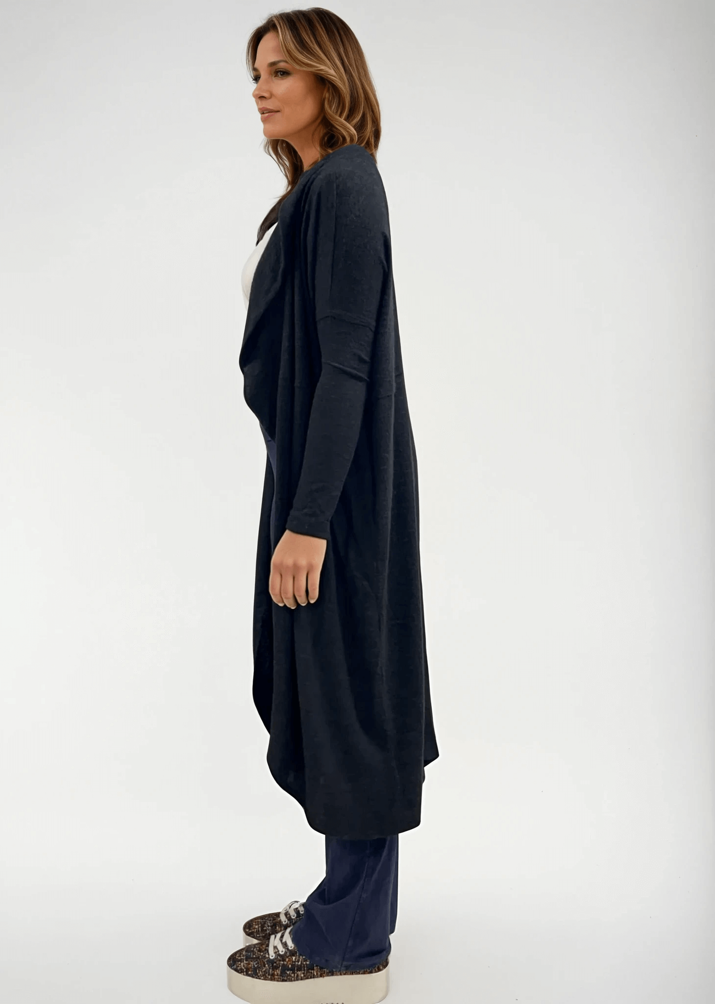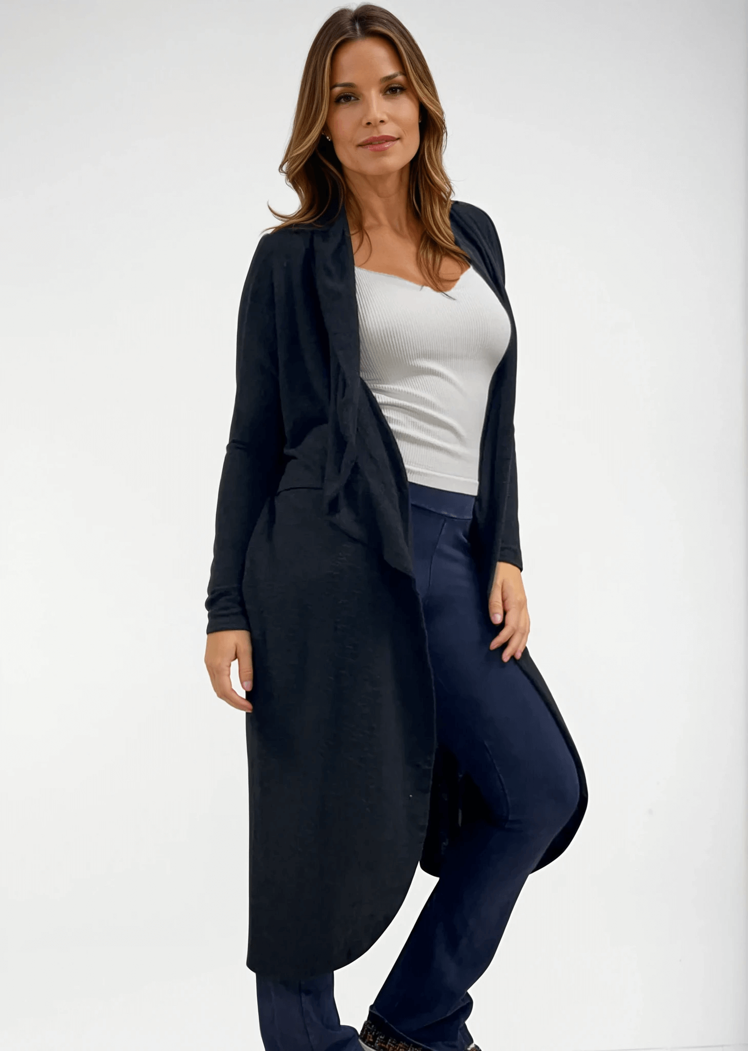 Experience cozy luxury with the Cuddle Cardigan in Black, made in the USA. Crafted from lightweight, plush fabric, this midi-length cardigan features a soft brushed shawl collar that wraps you in warmth without bulk. Perfect for relaxing or layering, it includes convenient side pockets to keep essentials close. Embrace comfort and style effortlessly with this versatile piece designed for your everyday ease and warmth.