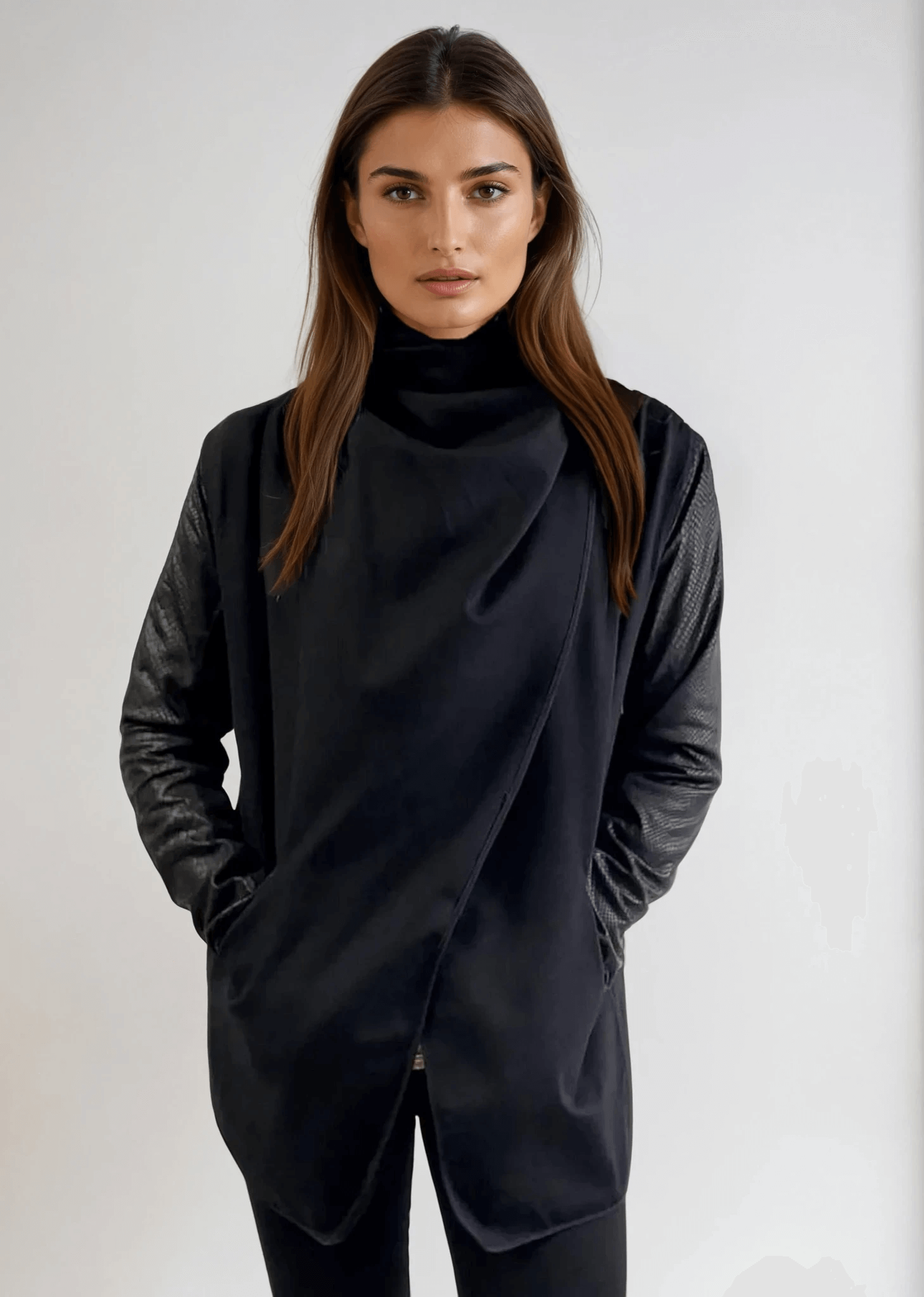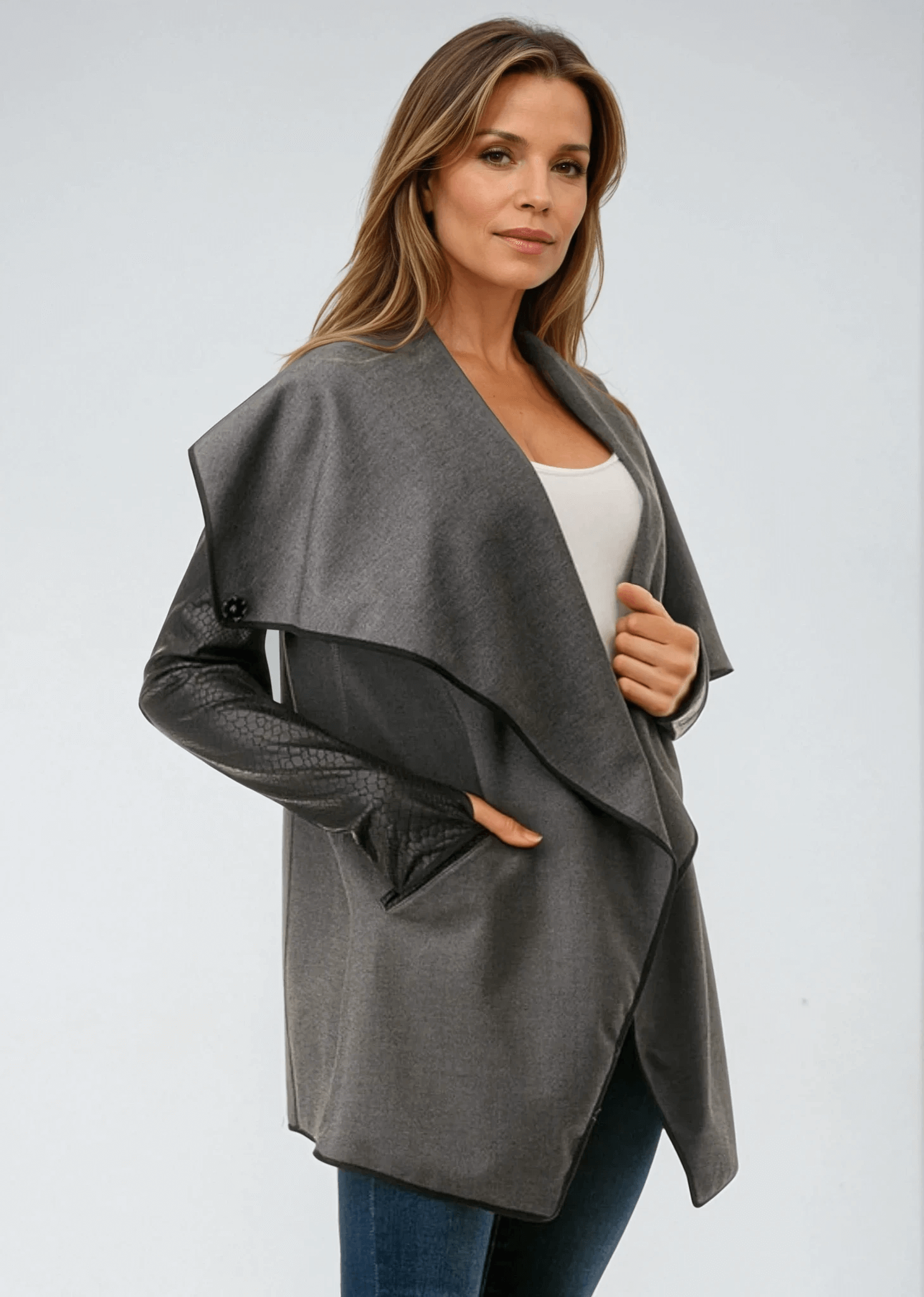The Allure Jacket is the perfect choice for any outfit. Featuring unique open front styling with faux leather sleeves and deep and roomy side pockets for convenience and comfort. Other accents like thumbholes and snaps on the lapel and shoulders complete this jacket. Loose fit provides a flattering and comfortable fit. This will be your Go To Jacket! Trendy gift idea for women of all ages!