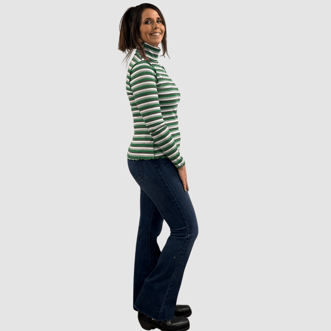 Stay stylish and comfortable with this Inside Out Seams Stripe Long Sleeve Top, proudly made in the USA. The lightweight ribbed fabric, mock turtle neck, and semi-fitted silhouette provide a flattering look and feel. Don't miss the special touches, like lettuce merrow stitch details and inside out seams for added color detail. Available in red or green stripes.