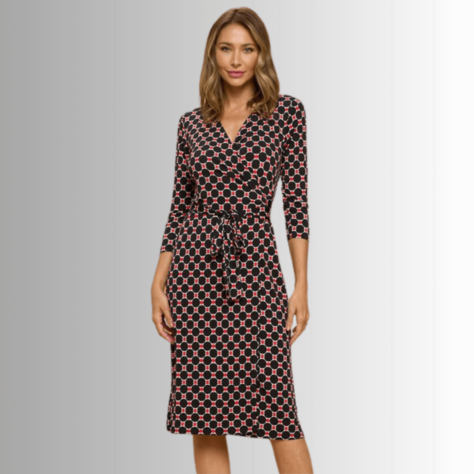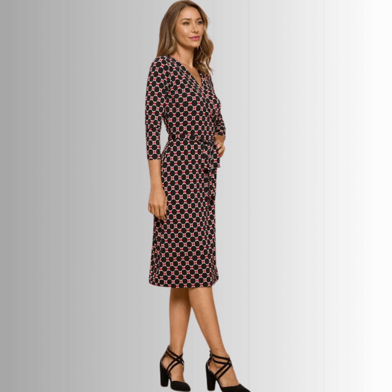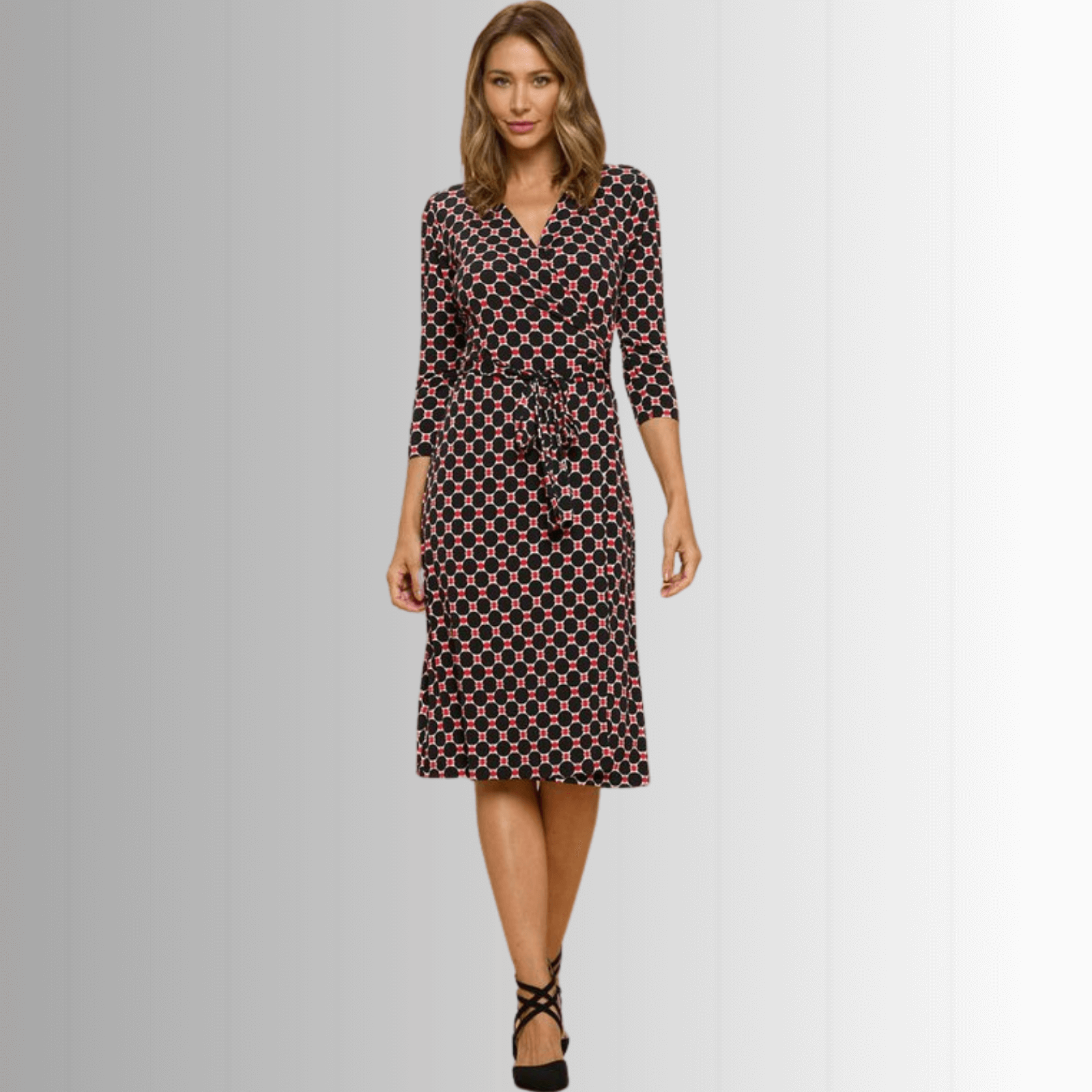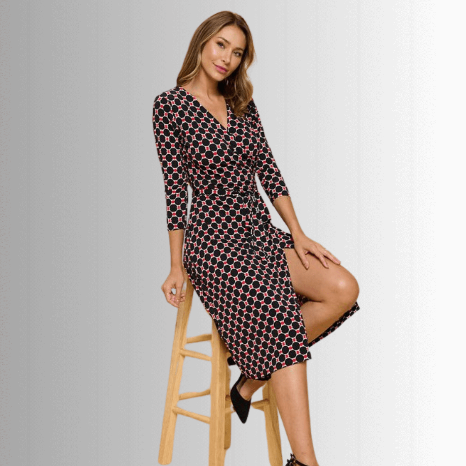 Add a feminine touch to any wardrobe with this stunning jersey wrap dress! Featuring a wrap design and midi length, you'll be turning heads in no time. With a flattering V-neck and 3/4 sleeves, plus a tie at the waist for a perfect fit. Topped off with a unique pattern, this dress will give you an air of classy elegance wherever you go!