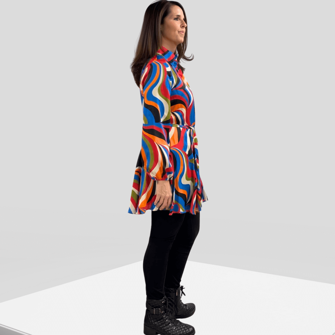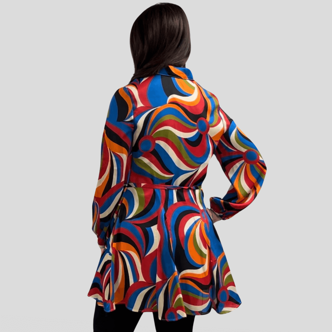 The versatile Alexis Tunic or Mini Dress is perfect for any occasion! Made in the USA, this button down shirt dress or tunic features a tie waist for a figure flattering fit, a collared neckline, and elastic cuffs. The flowy and relaxed fit, along with unique patterns like Autumn Feels or Retro Print, make it a must-have in your wardrobe. Made with 100% polyester and delicate wash, this dress is both comfortable and high quality. Elevate your style and support American made with the Alexis Tunic or Mini Dress.