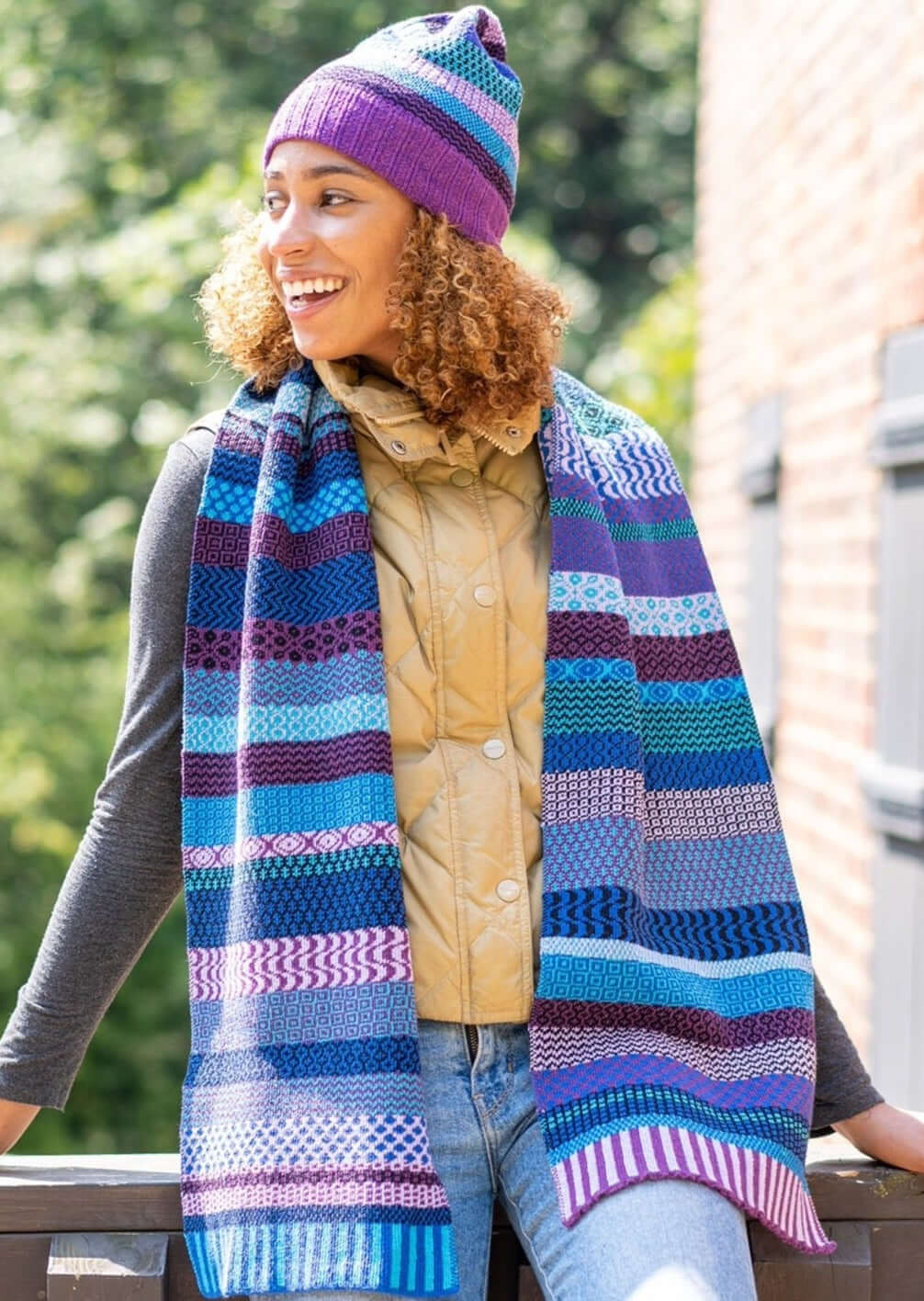 Colors in this hat: turquoise, purple, black, lilac, royal blue.