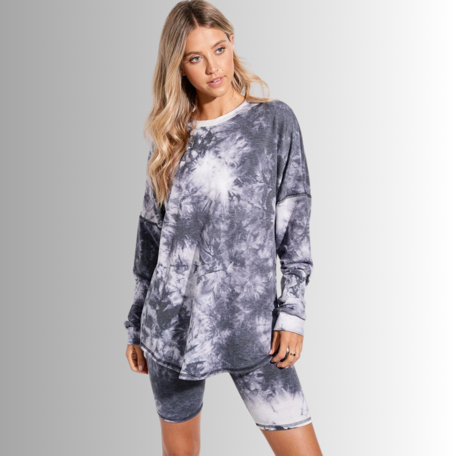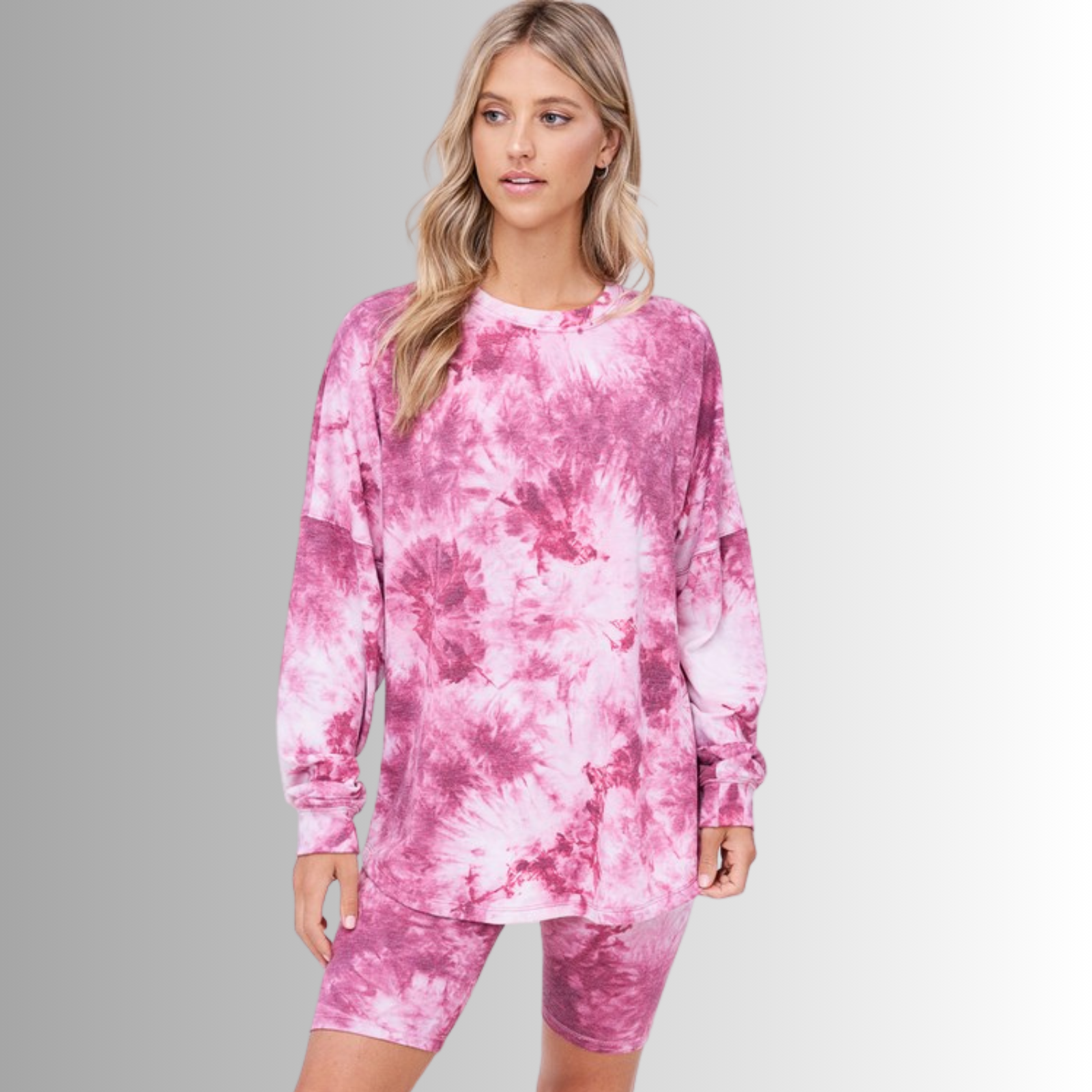 This Cozy Tie Dye Pajama Lounge Set is the perfect addition to your loungewear collection. Made in the USA with super soft, lightweight material, it includes an oversized top with a wide round neck and elastic waist biker shorts.