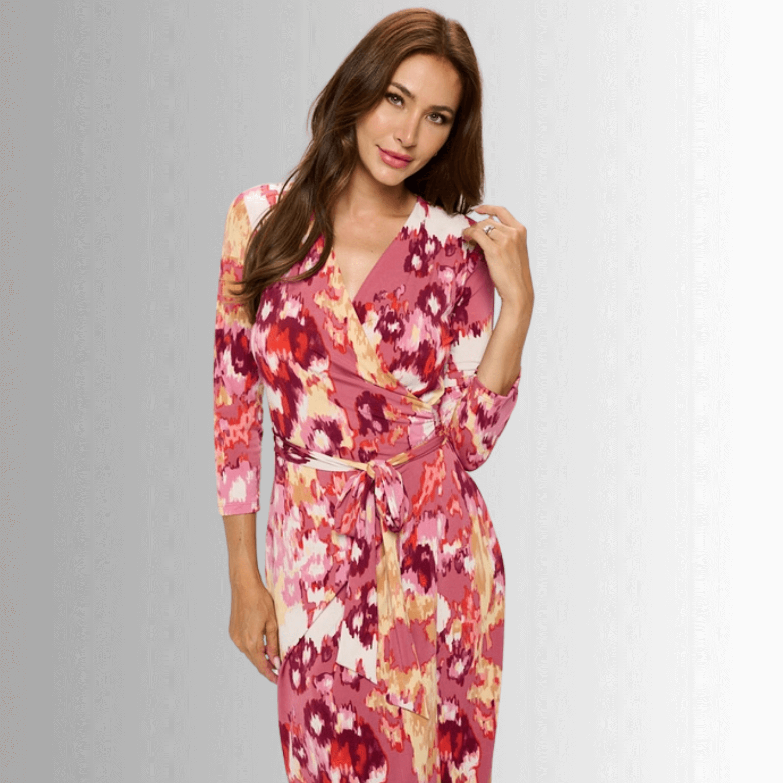 Add a feminine touch to any wardrobe with this stunning jersey wrap dress! Featuring a wrap design and midi length, you'll be turning heads in no time. With a flattering V-neck and 3/4 sleeves, plus a tie at the waist for a perfect fit.  Topped off with a unique pattern, this dress will give you an air of classy elegance wherever you go!