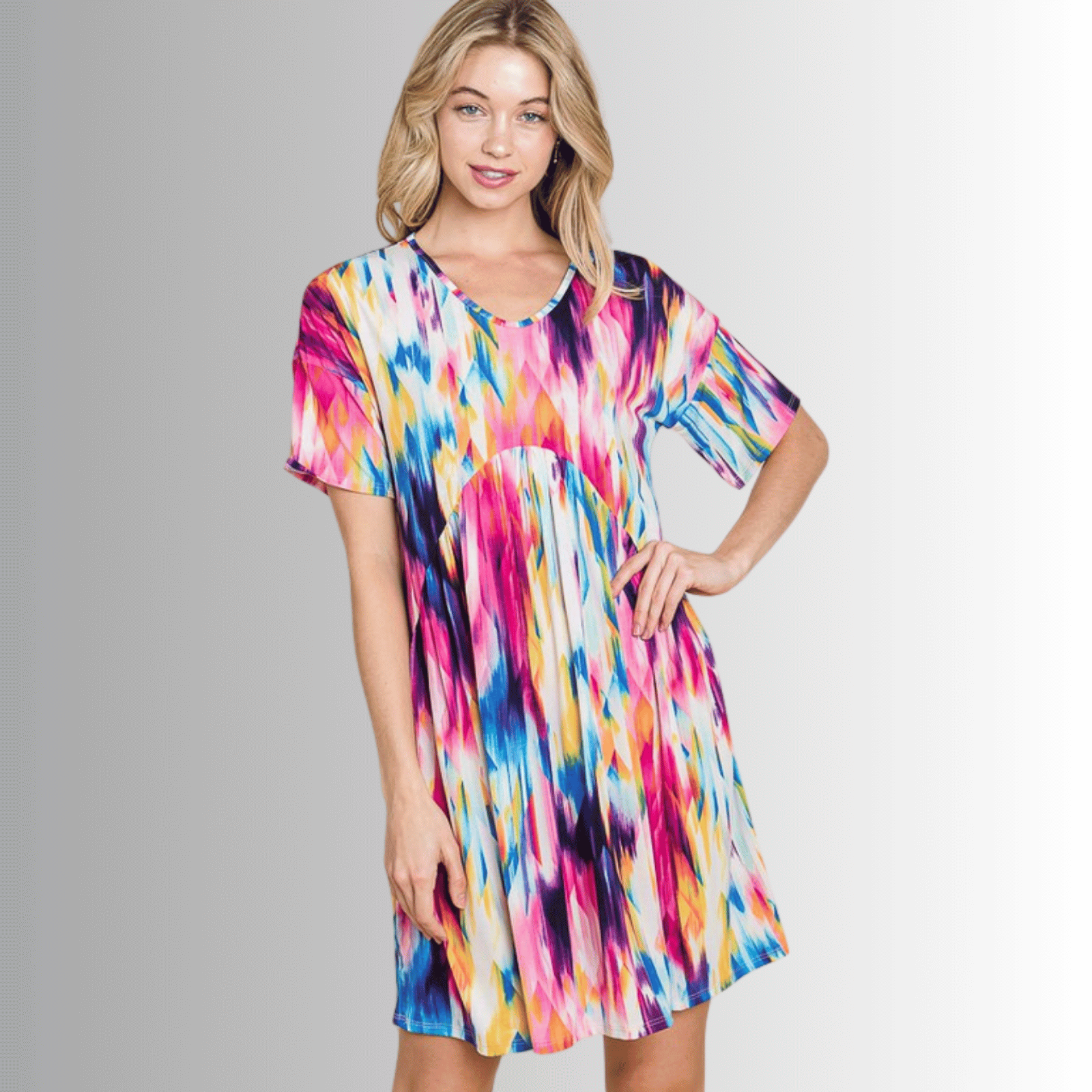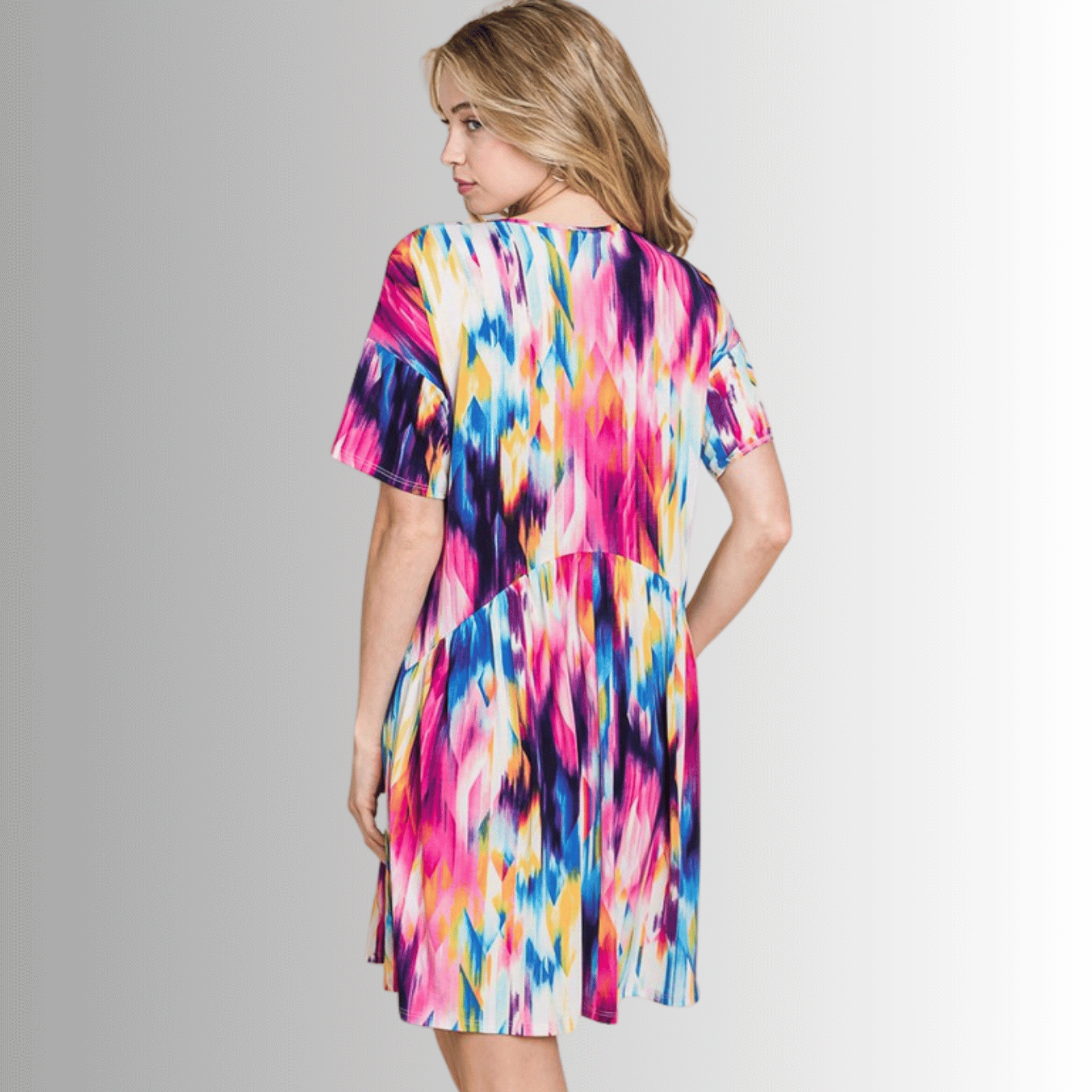 Unleash your colorful side with the Lily Vivid Colorful Print Dress. Made for summer, this mini dress features a round neck and short sleeves for a comfortable fit. Stand out with its vivid colors and make a statement wherever you go. (Summer never looked so good!)