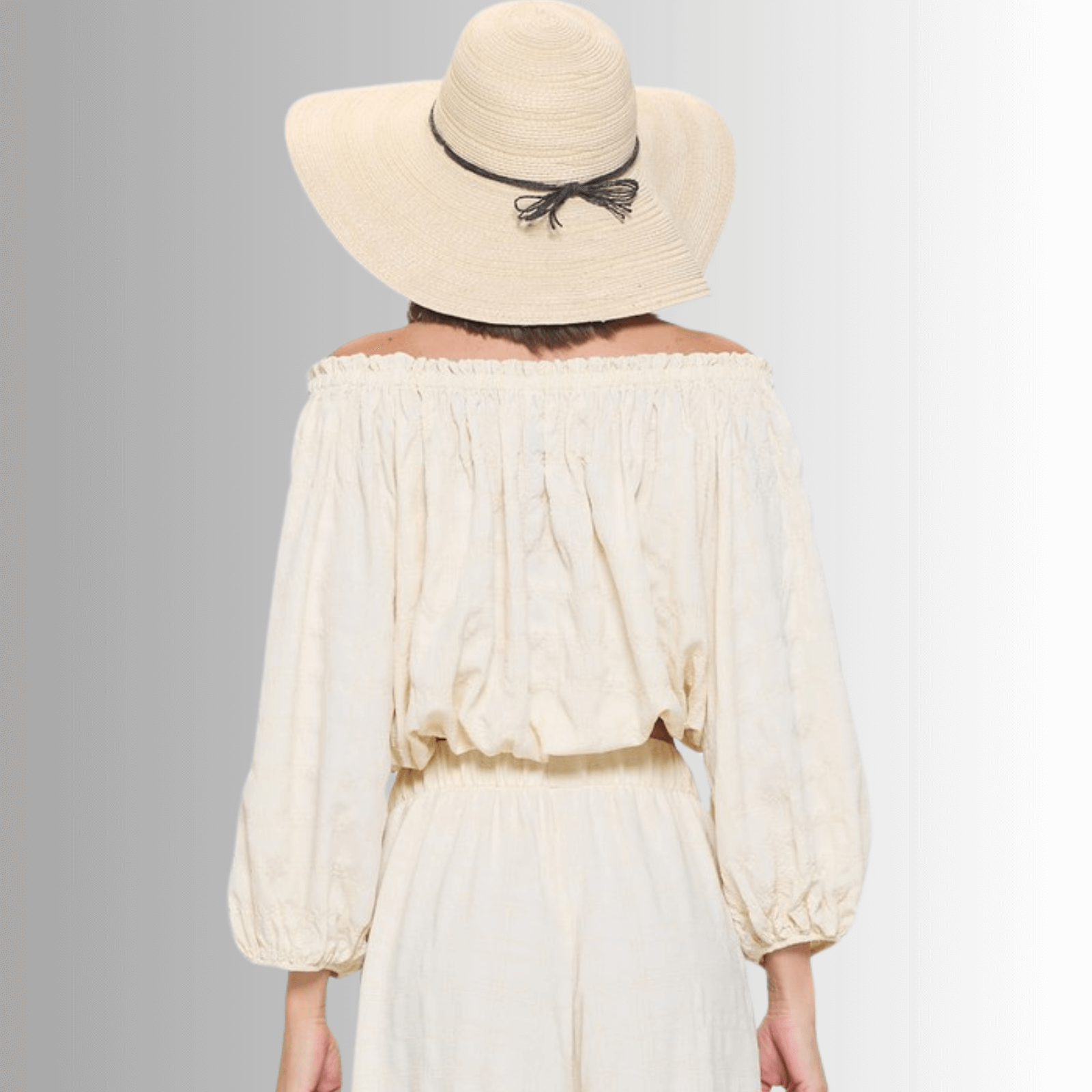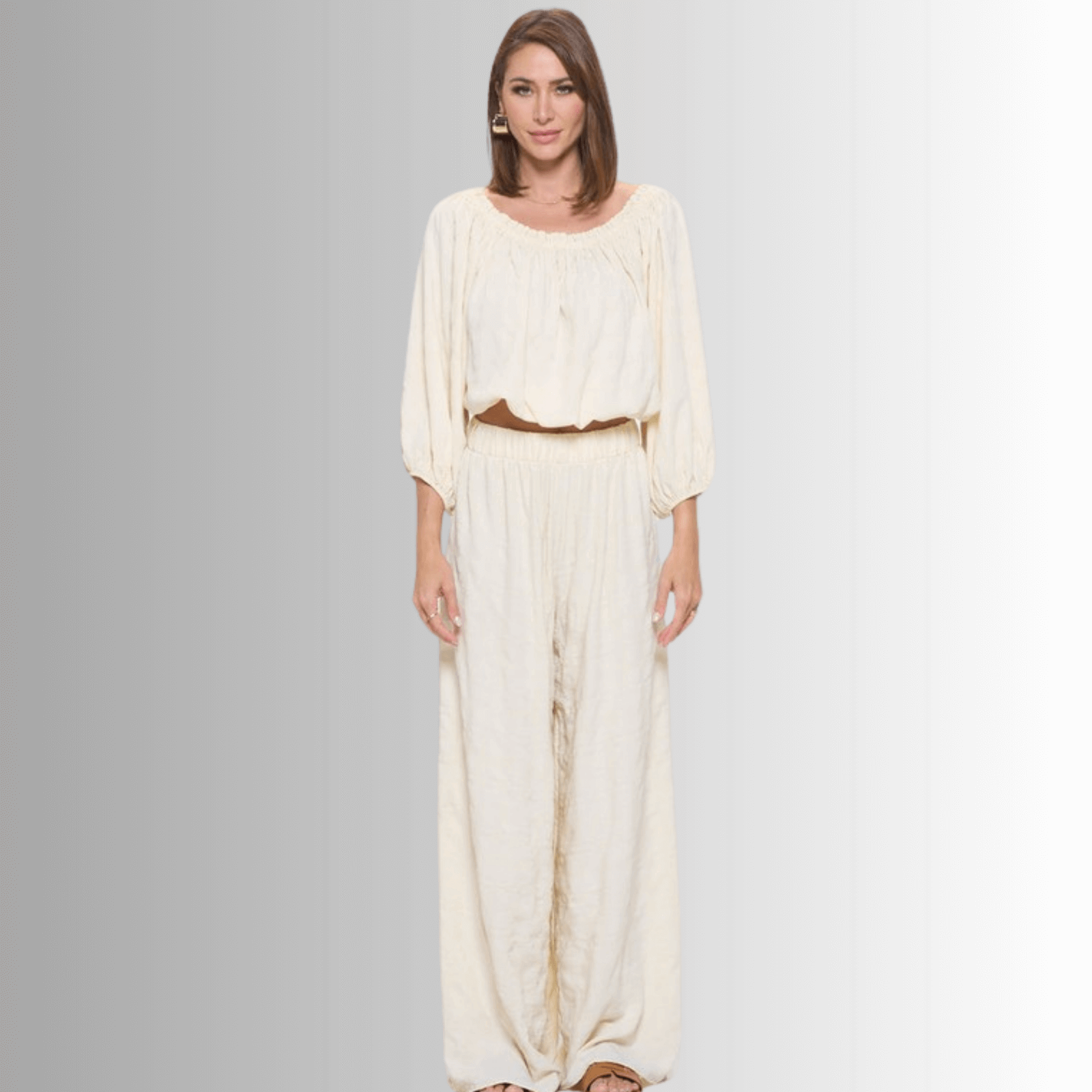 Take style to new heights with our Hamptons Textured Cropped Top! The off-the-shoulder design and elastic detailing create a bold and daring look, while the lightweight material ensures comfort all day long. Complete the outfit with our matching palazzo pants. Made in USA.