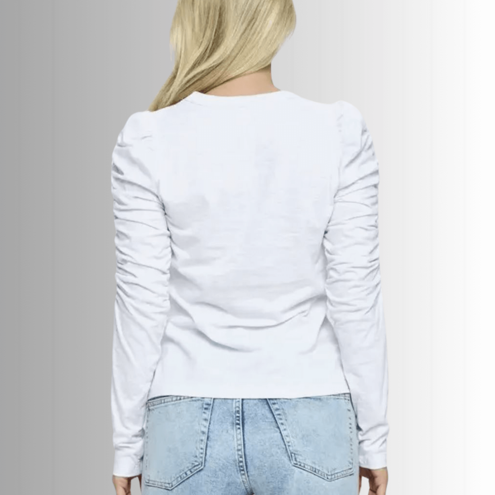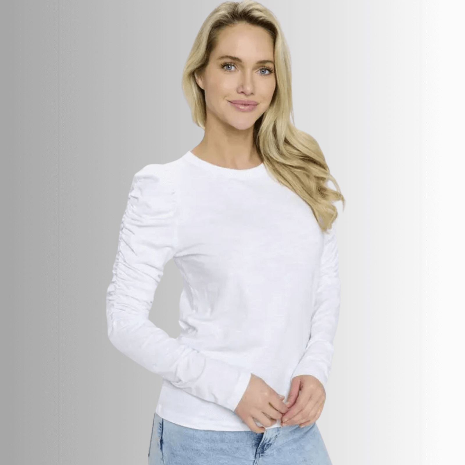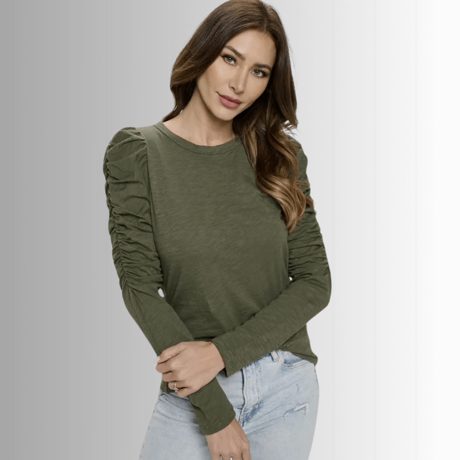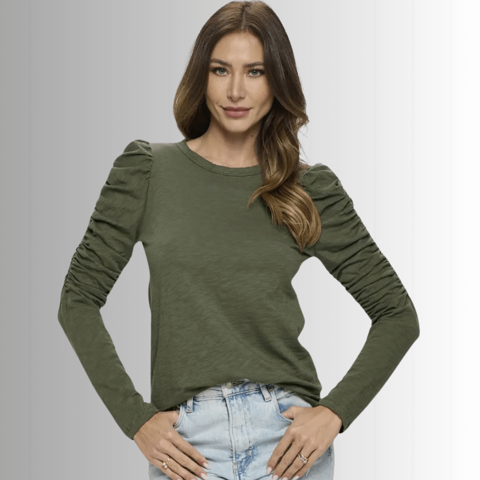 This stylish and comfortable Cotton Puff Sleeve Top features a fitted design with a round neck and gathered puff sleeves for modern elegance. Crafted from a Cotton/Spandex blend for a soft feel, it is machine washable and available in White, Black and Olive.