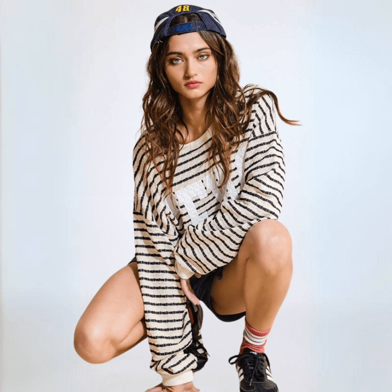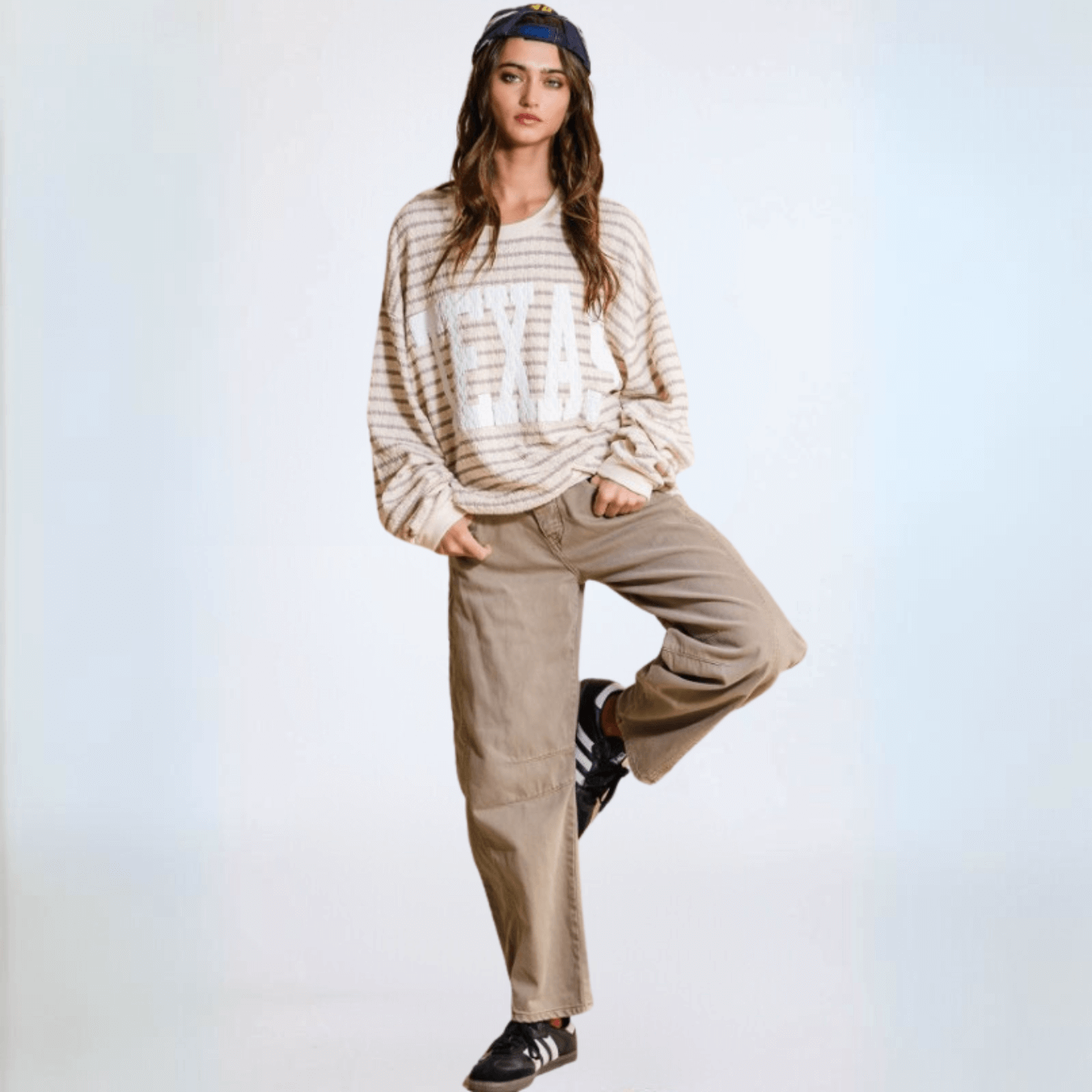 Elevate your casual wardrobe with our Bucket List Fashion Oversized Graphic 'TEXAS' Sweatshirt. Perfect for Game Day or any day!  Crafted from a soft textured fabric, it features a vintage-inspired 'TEXAS' graphic, crew neck, and long sleeves. The oversized, slouchy fit and striped design add a touch of effortless style. Made in the USA with high-quality materials. 50% Cotton, 43% Polyester, 7% Spandex.