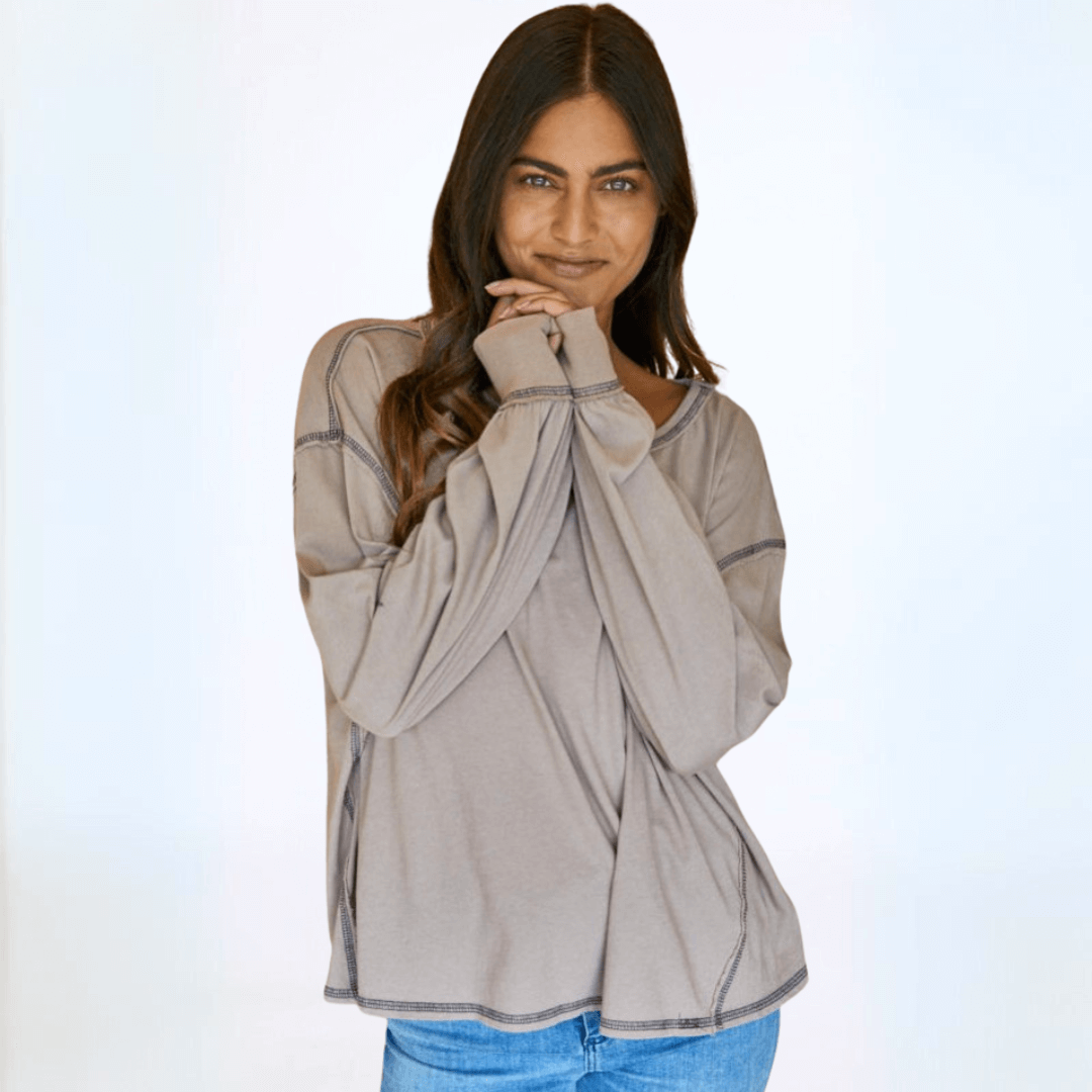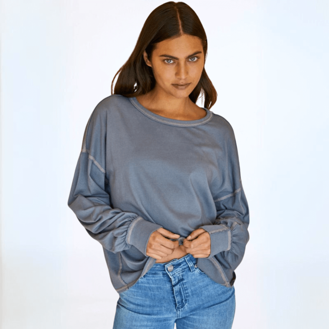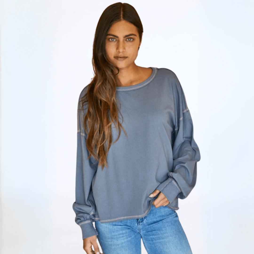 Expertly crafted in the USA, the Owen Oversized Top features a boxy stitch detail for a modern yet relaxed fit. The garment dyed fabric offers a soft feel, while the raw edge and contrast stitch details add a touch of edginess. With long sleeves, a wide round crew neck, and banded cuffs, this top is perfect for any occasion. Available in graphite and taupe.