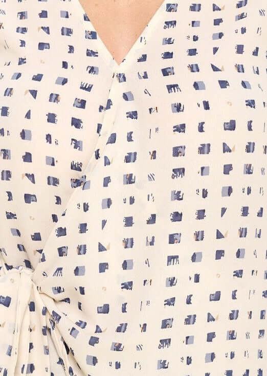The Flattering Statement Top is a versatile addition to any wardrobe with its tie front design and subtle cap sleeves. The eye-catching geo pattern in ivory and blue adds a touch of elegance to this v-neck top. Perfect for any occasion, this waist-length top will become a staple piece in your closet.