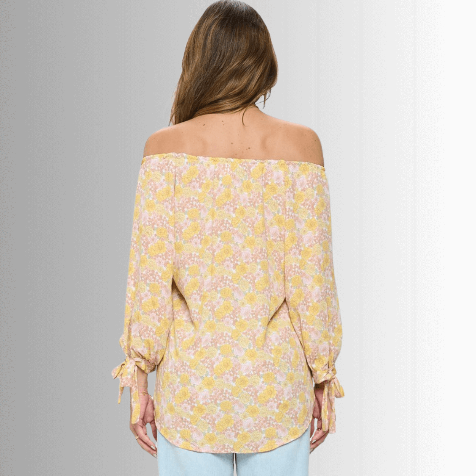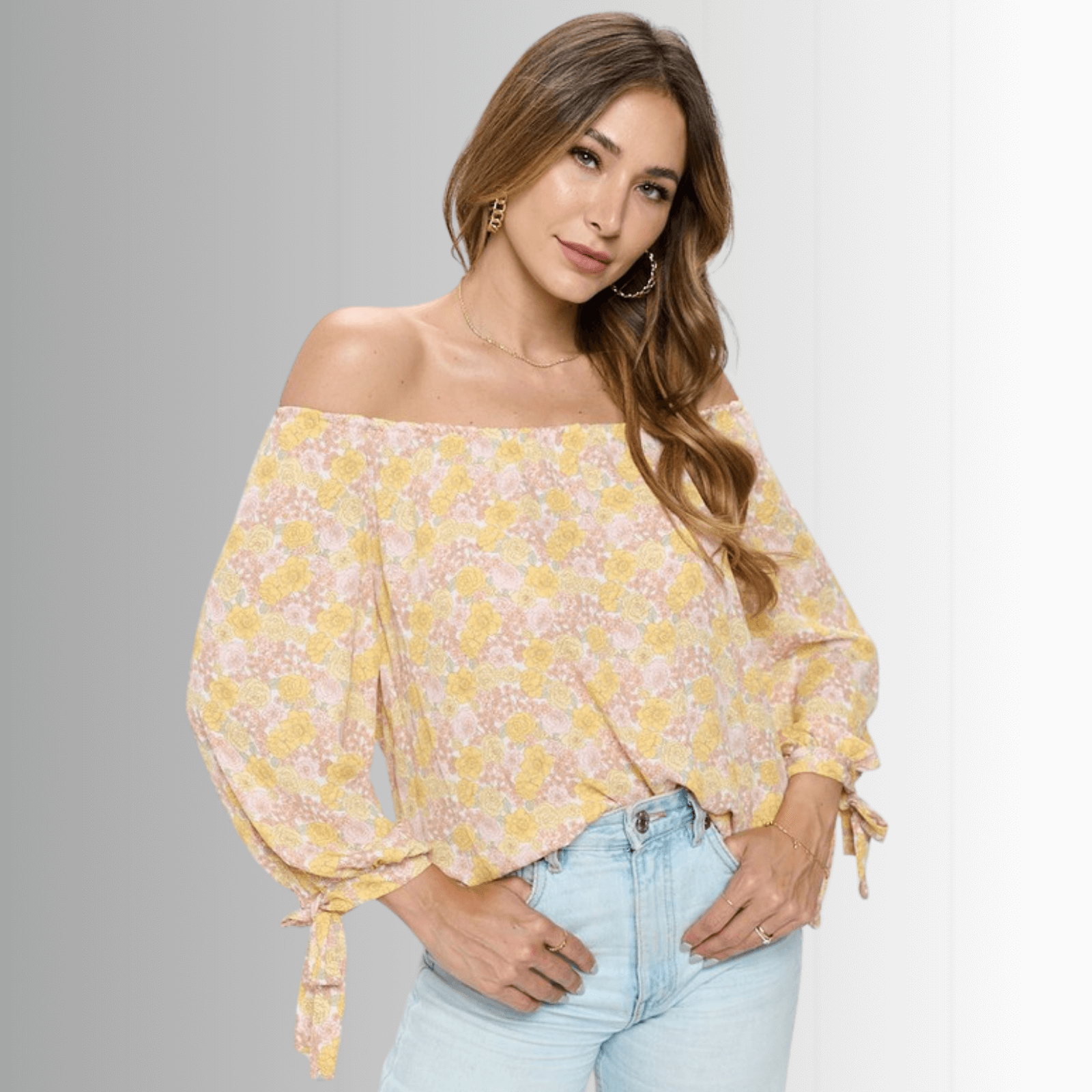 Get ready for spring with our 'Spring is in the Air' floral top! This off-the-shoulder top features three quarter sleeves with a playful tie detail, a lightweight non-stretch fabric, and a longer length for versatile styling options. Dress it up or down with the vibrant yellow floral print.