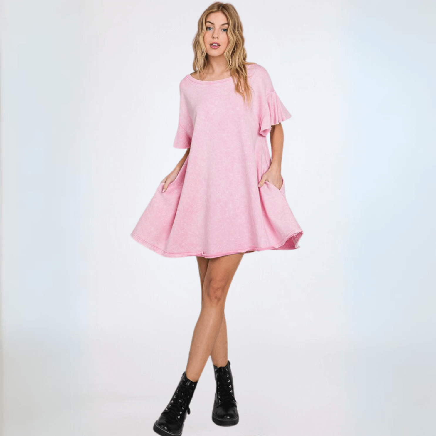 Unleash your playful side with our Mineral Washed Cotton French terry dress in Pink or Baby Blue! With a flattering oversized baby doll fit and flare ruffled sleeves, this dress is both fashion-forward and functional with side pockets. Made from breathable medium weight French terry fabric, perfect for everyday wear or as a swim cover up by the pool or at the beach. Available in Pink or Blue, and proudly made in the USA with 100% cotton. Get ready to turn heads wherever you go!