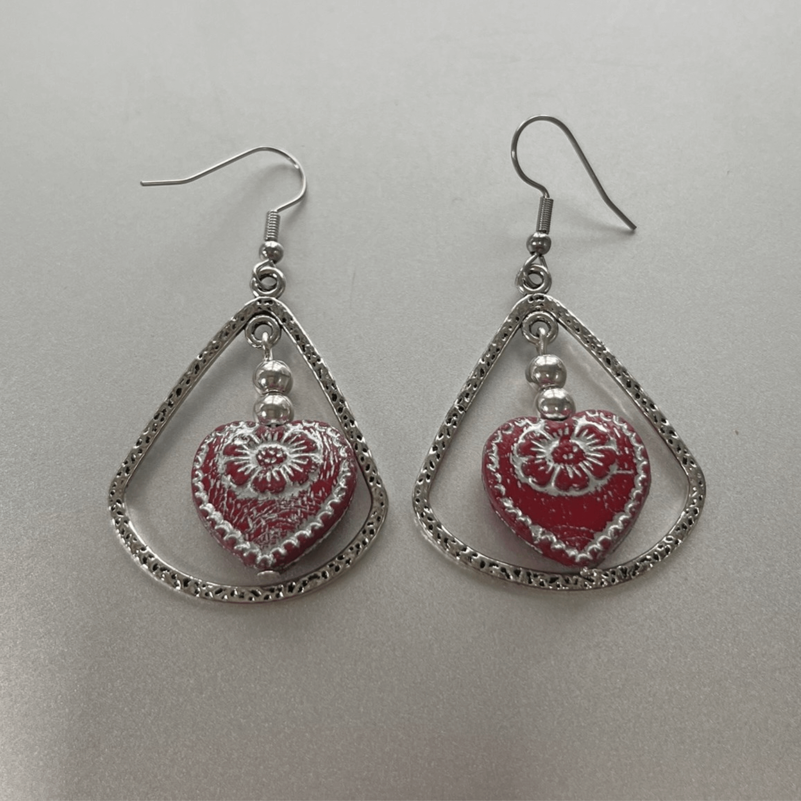Handcrafted by a local artisan in Missouri, USA, these Vintage Red Glass Heart Hoop Earrings feature unique red dropped hearts on a 2.25' hoop. Made with natural stones and handmade details, each pair is one-of-a-kind. Upgrade your style with these stunning, Made in USA earrings.